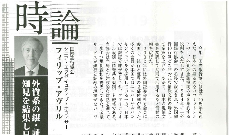As the International Bankers Association of Japan (IBAJ) marks its 40th anniversary, we are honoured to have our journey featured in the November 19, 2024 edition of Kinzai. This milestone article not only highlights the evolution of IBAJ—from a gathering of foreign banks in 1984 to a robust association representing 77 members across banking, securities, and asset management—but also features insights from Philippe Avril, Senior Executive Officer of IBAJ.