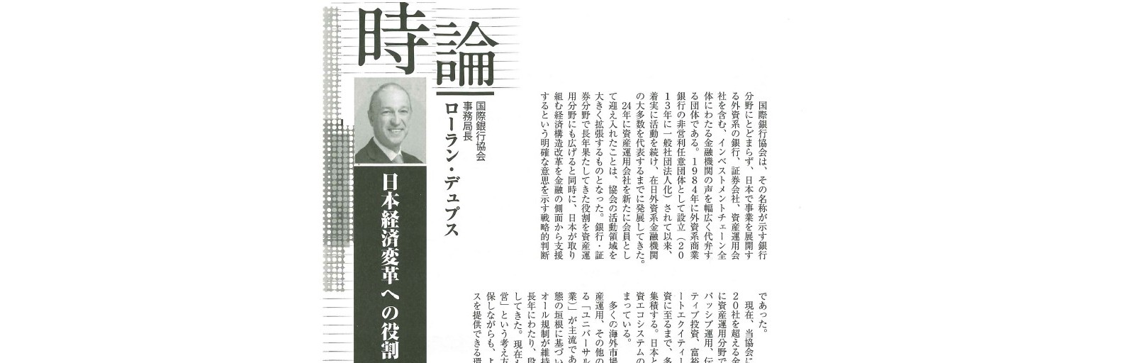 IBA Japan was featured again in Kinzai in an article titled “The Role of Foreign Financial Institutions in Japan’s Economic Transformation.” The article highlights IBA Japan’s role as a platform for foreign financial institutions operating in Japan across banking, securities and asset management, and notes the Association’s expansion to welcome asset management firms as members from 2024.